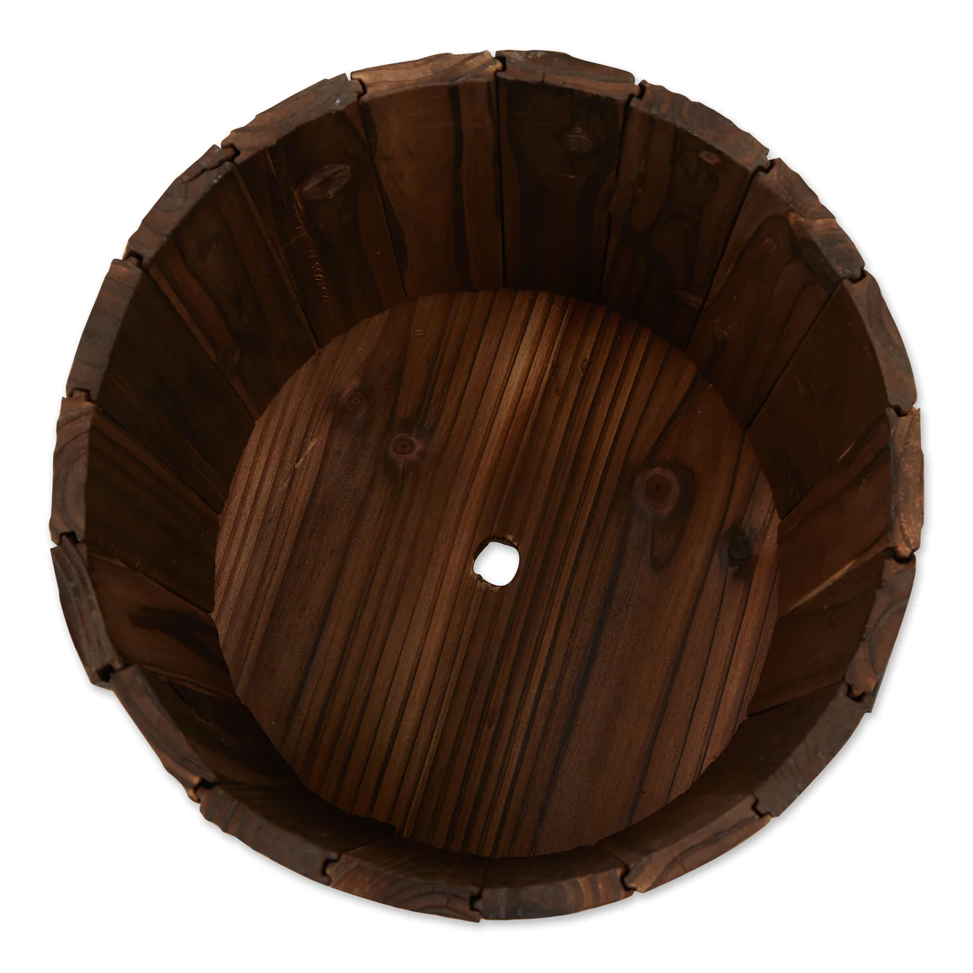 • This trio of planters have a look of aged oak barrels, complete with black metal banding and handles for ease of relocating around your yard as the mood or sun strikes. Each planter has a different size to allow you to make these the charming homes for a variety of plants.