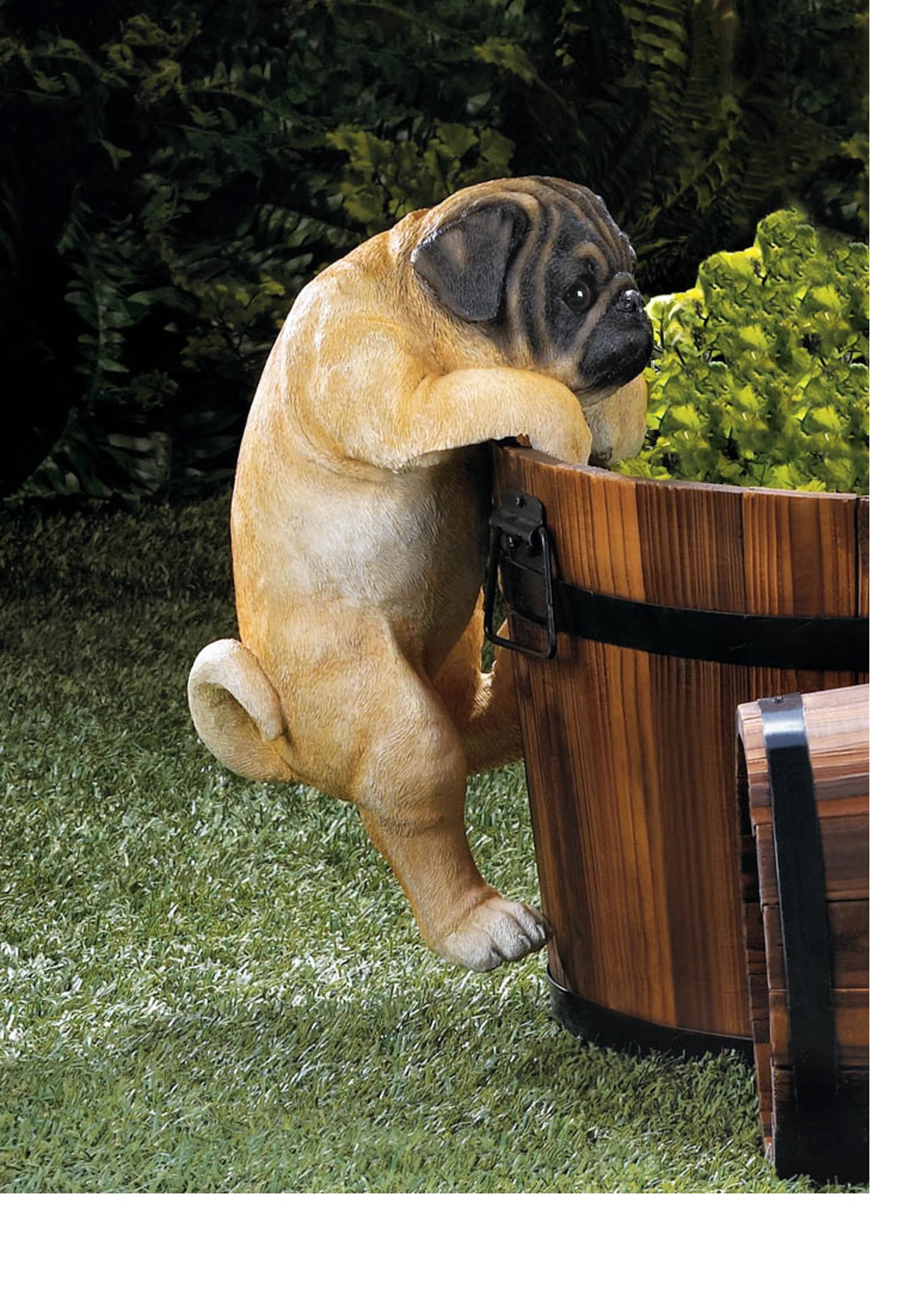 • This mischievous pug named Daisy is climbing with all her might! A charming accent for your favorite potted plant or your fence that will give your space some personality. Can rest on a rail with a width of up to 1.5 inches.