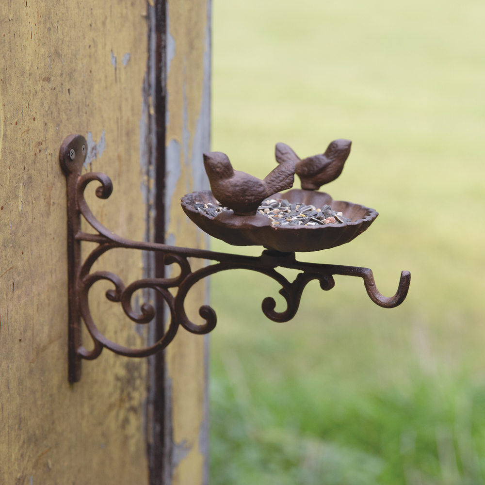 Invite nature's beauty right to your doorstep with this rustic feeder. Crafted with rustic elegance and charm, our Wall-Mounted Bird Feeder Station is a must-have for garden decor. This feeder rotates 360 degrees and is crafted from cast iron. To hang, use its four screw-hole hangers.